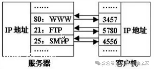 需要注意的是,端口并不是一一对应的。比如你的电脑作为客户机访问一台WWW服务器时,WWW服务器使用“80”端口与你的电脑通信,但你的电脑则可能使用“3456”这样的端口。如下图所示: