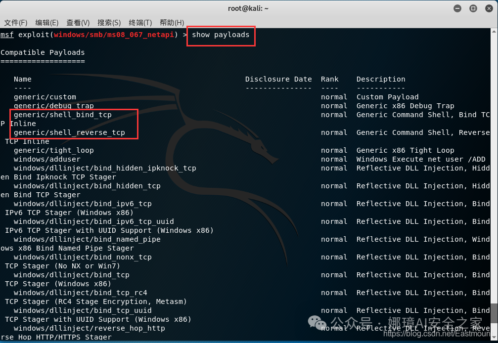 反弹shell成功:set payload generic/shell_bind_tcp