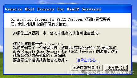 有时XP系统会提示“Generic Host Process for win32 services”错误。这是svchost.exe错误,内存溢出造成。