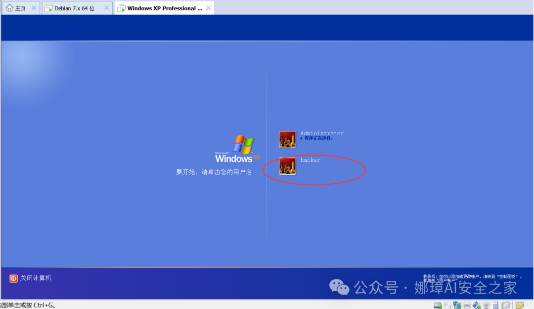 输入创建的用户名hacker和密码123456回车,弹出提示框点击OK,稍等就会成功远程登录XP系统。