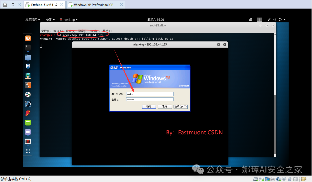 接着输入“rdesktop 192.168.44.135”连接远程IP地址,并输入我们创建好的hacker用户名及密码。