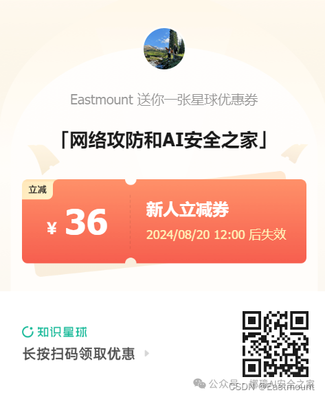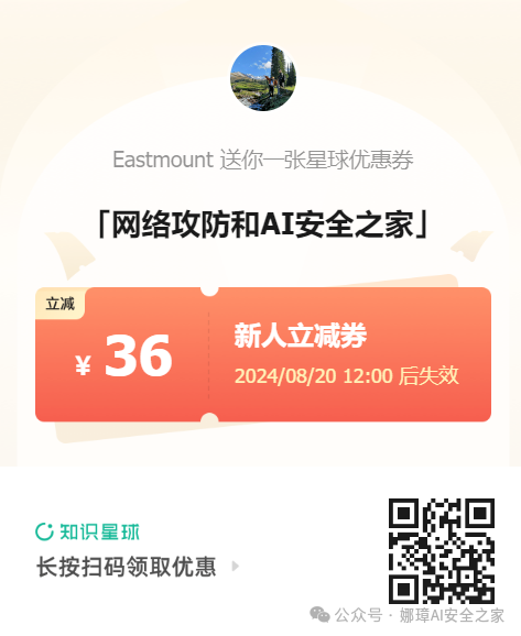2024年4月28日是Eastmount的安全星球 —— 『网络攻防和AI安全之家』正式创建和运营的日子,该星球目前主营业务为 安全零基础答疑、安全技术分享、AI安全技术分享、AI安全论文交流、威胁情报每日推送、网络攻防技术总结、系统安全技术实战、面试求职、安全考研考博、简历修改及润色、学术交流及答疑、人脉触达、认知提升等。下面是星球的新人券,欢迎新老博友和朋友加入,一起分享更多安全知识,比较良心的星球,非常适合初学者和换安全专业的读者学习。