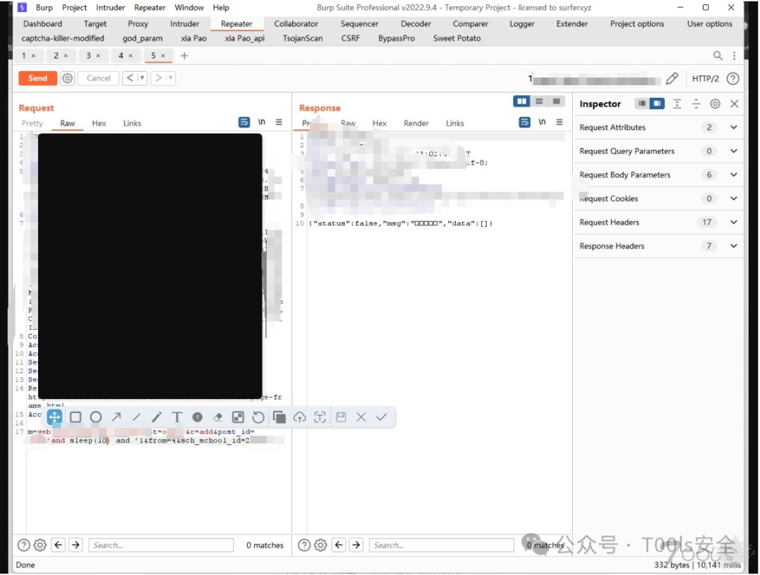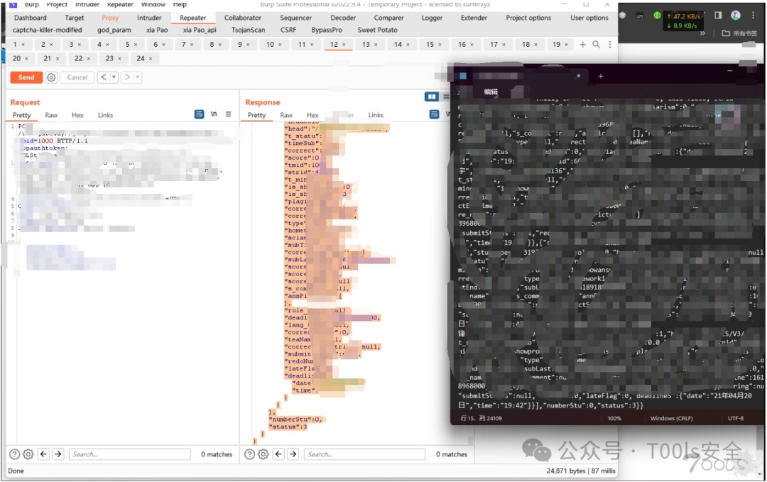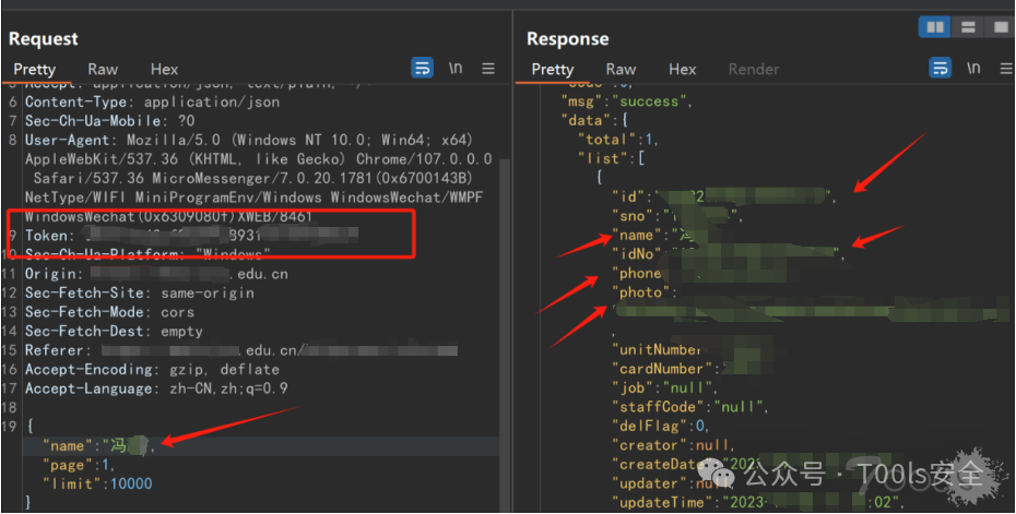 个人信息查询——>越权(这里简单说一下,有时候可能小程序的个人主页在UI上面只显示了姓名,学号,性别这些信息,如果将这个包发到burp当中可能会有一些意外的收获如身份证,电话等等信息在数据包当中)