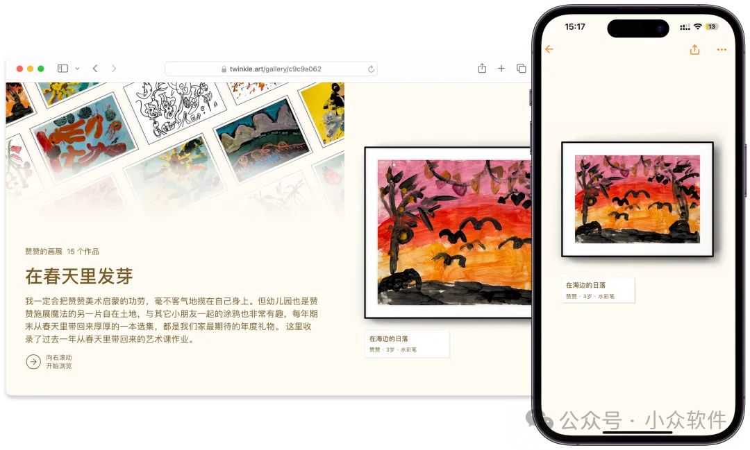 闪闪童画还支持创建线上画展。我们只需要简单设置一下画展主题和简介,即可一键生成线上画展链接,轻松与他人分享孩子的作品。