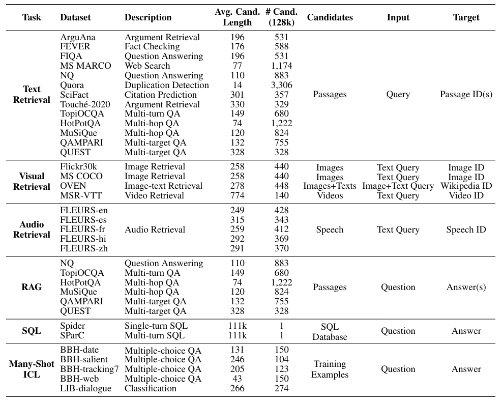 LOFT(Long-Context Frontiers)基准测试的设计旨在全面评估长上下文语言模型的能力。LOFT包含六大类任务,涵盖35个数据集,横跨文本、视觉和音频多个模态: