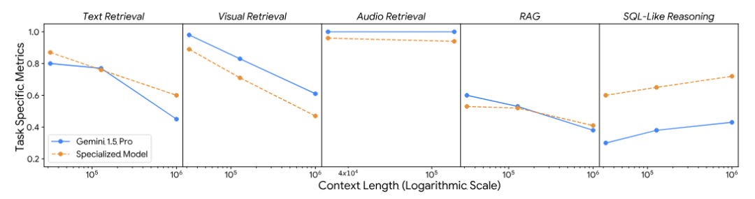 结果还真是这样,最近谷歌发布专门用于评估长上下文语言模型的LOFT测试基准,该测试基准评估长上下文LLM在各种实际任务中的表现,包括信息检索、问答和数据库查询等。LOFT的测试结果显示,一些最先进的长上下文模型在某些任务上已经达到了与专门训练系统相近的性能水平。