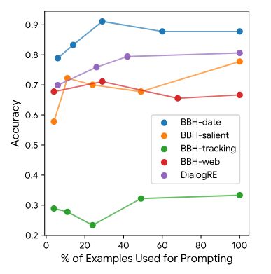 然而,在一些推理密集型任务中(如BBH-tracking7),增加示例数量并未带来显著改善,这表明模型在复杂推理任务上仍有局限性。