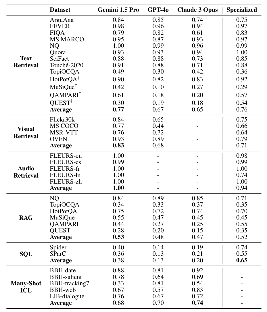 LOFT基准测试的结果既展示了长上下文模型的潜力,又揭示了一些挑战。研究团队评估了三个最先进的长上下文模型:Google的Gemini 1.5 Pro、OpenAI的GPT-4o和Anthropic的Claude 3 Opus。这些模型在各种任务上的表现如下表所示: