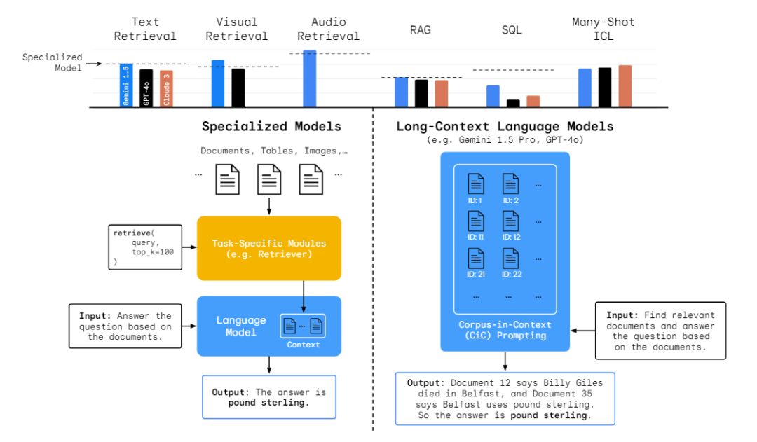 相比之下,上图右侧展示长上下文语言模型(LCLM)的潜力。LCLM可以直接接收包含文本、图像、音频等多模态信息的整个语料库作为输入。通过"语料库中的上下文"(CiC)提示方法,模型能够在统一的框架内执行各种任务,包括检索、推理和答案生成。这种方法大大简化了流程,并且避免了多个独立系统可能带来的错误累积问题。