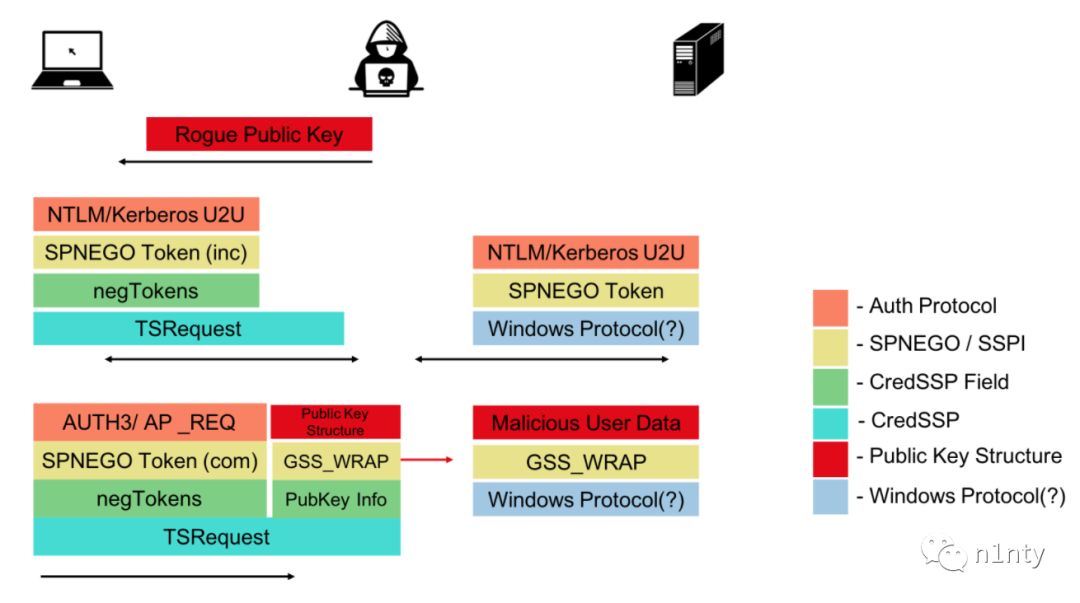 攻击者站在中间人的位置,伪装成一个 CredSSP server