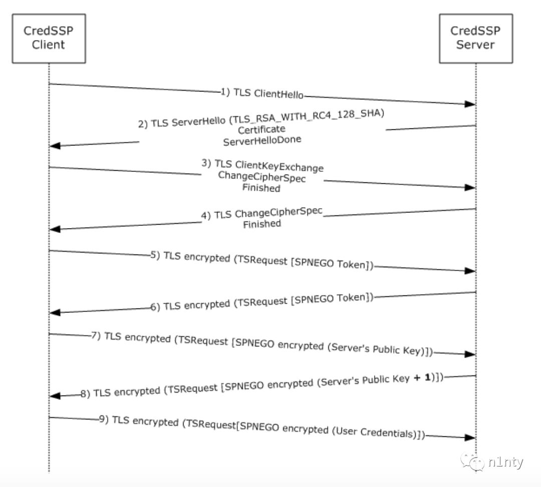 问题出现在上面提到的第 2 步,所以这里再细化一下第 2 步。下面是一张更详细的 CredSSP 流程图:
