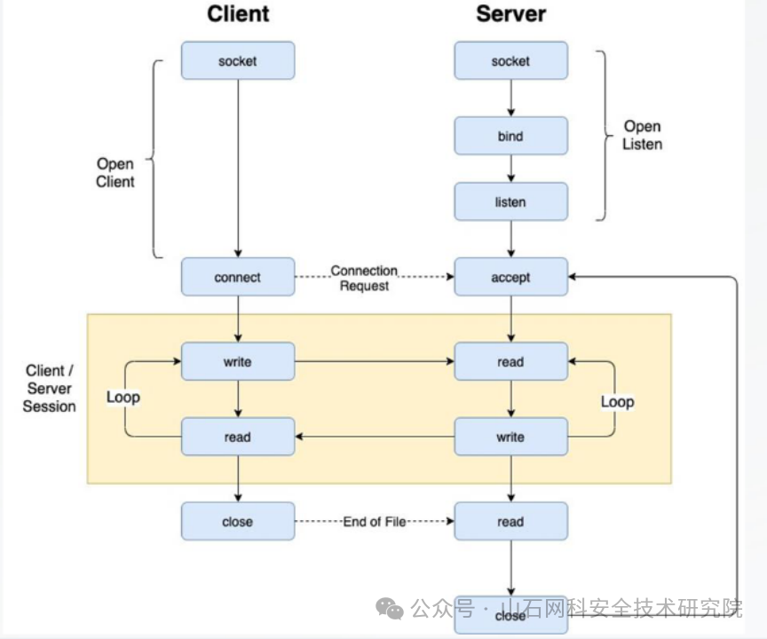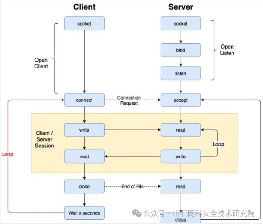 我们现在看一下标准的CS交互逻辑,client发送socket(针对的是应用层探索)请求,server解析并建立连接,然后交互数据最后关闭: