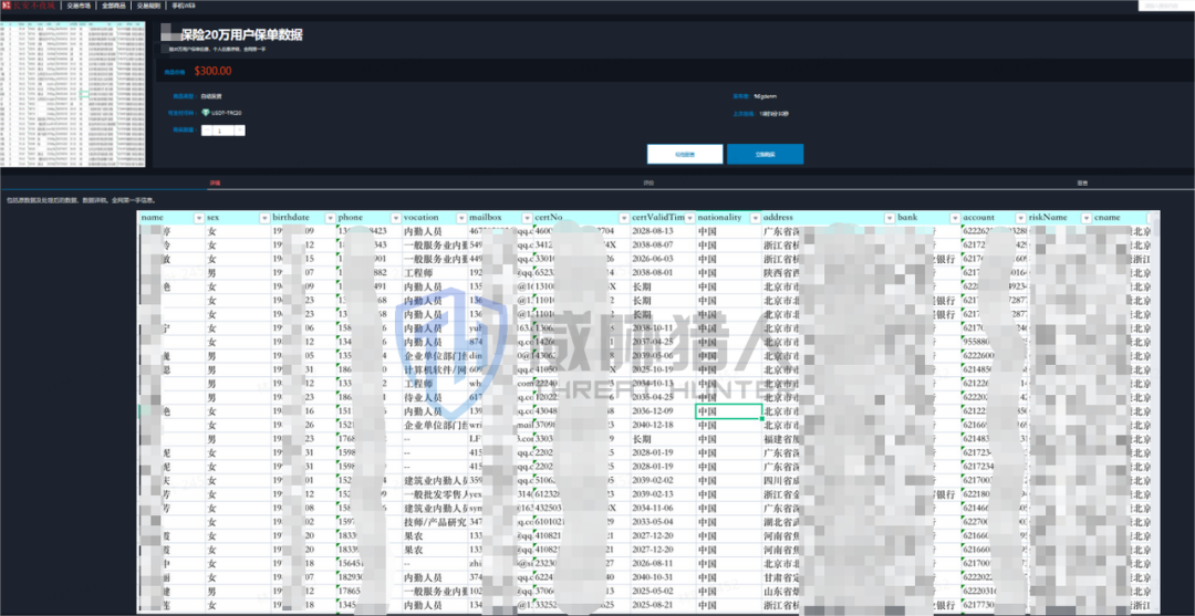 威胁猎人在暗网平台渠道的监测情报分析发现,国内某保险机构20万用户保单信息数据被黑产进行售卖,以300美元的价格进行出售,泄露的数据样例中不仅包含用户姓名、手机号等基础信息,此外还有用户的工作岗位、家庭地址以及银行卡等信息。
