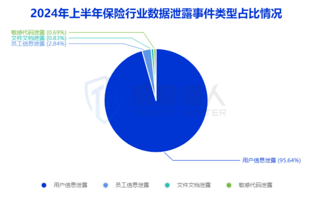 威胁猎人针对保险行业泄露的数据信息进行分析发现,泄露的数据中用户信息类占比高达95.64%,为非法数据交易的主要类型。