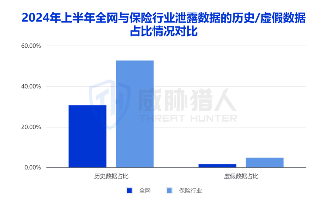 威胁猎人针对保险行业被黑产交易的数据进行真实性验证分析发现,其虚假数据、历史数据占比远超全网整体水平: