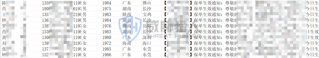 威胁猎人在匿名聊天平台渠道的监测情报分析发现,有黑产在售卖保险机构用户短信信息数据,以下为提供的数据样例信息。