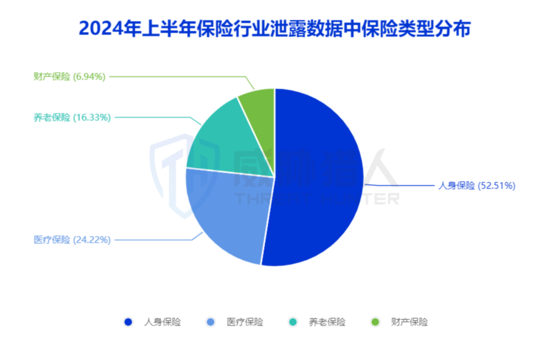 2024年上半年保险行业被泄露的数据中,涉及“人身保险”的数据占比最高,达52.51%;进一步分析发现,“人身保险”产品中,“人寿保险”、“年金保险”居多。