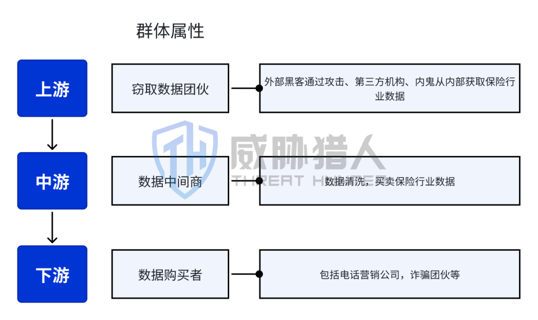 威胁猎人针对保险行业数据泄露产业链进行深入研究,发现围绕数据资产泄漏和倒卖的产业链目前已经相当成熟,基于明确的分工和定位分为上、中、下游。
