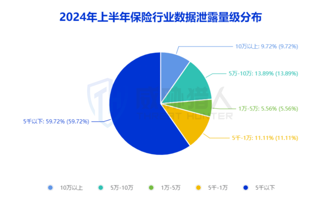 2024年上半年,威胁猎人捕获到的保险行业黑产数据交易量级以5000条以下小规模居多,占比59.72%。