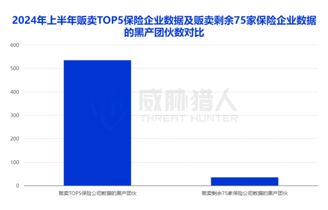 2024年上半年Top5均是国内保险十大品牌的保险机构,机构规模大、平台用户群体多、用户数据量大,贩卖Top5保险机构数据的黑产团伙534个(非法贩卖保险企业信息数据的黑产团伙共计569个)。