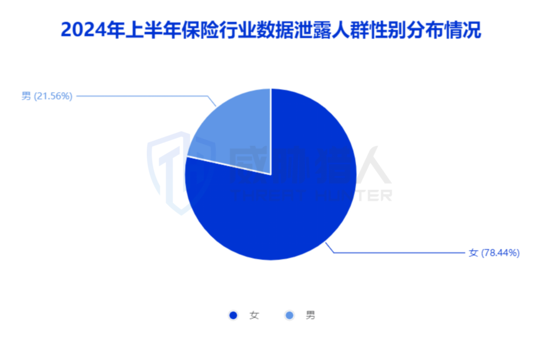 威胁猎人通过对保险行业泄露数据的人群画像进行抽样分析,发现保险行业数据泄露的受害群体,在地区上主要集中在浙江、四川、江苏等地;在年龄分布上,35岁至54岁之间的人群占比最多,达68.85%;在性别分布上,女性占比78.44%,远超于男性占比21.56%。