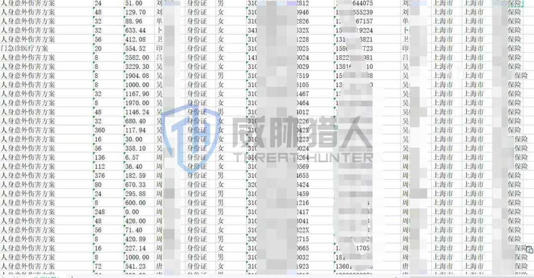 威胁猎人发现此类数据样例泄露的数据字段较为齐全,不仅包含个人信息,且包含保险信息,同时涉及多家保险机构,因此威胁猎人初步判断为该多家保险机构有关联合作的第三方所导致的泄露。