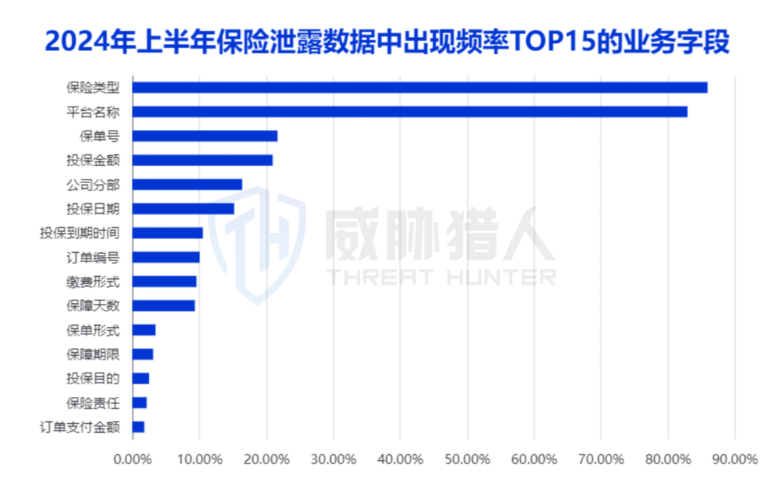 威胁猎人针对保险业务信息字段进行分析发现,“保险类型”、“平台名称”、“保单号”、“投保金额”等字段的出现频率较高,其中“保险类型”最高,高达85.97%,其次是“平台名称”,高达82.97%。这些数据指向性非常高,诈骗团伙一旦获取到这些数据,可精准地掌握到保险机构用户的投保情况并进行诈骗。