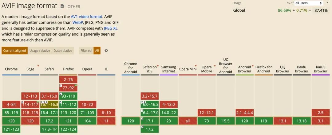 大部分 Web 开发者对 WebP 格式非常熟悉了,但可能对 AVIF 格式还没有开始应用。AVIF 是一种基于 AV1 视频编码的新图像格式,用于将AV1压缩的图片或图片序列存储为HEIF文件格式。相对于JPEG,WEBP 这类图片格式来说,它的压缩率更高,并且画面细节更好,AVIF vs JPEG 大小节省约 50%,AVIF vs WebP 大小节省约 20%。