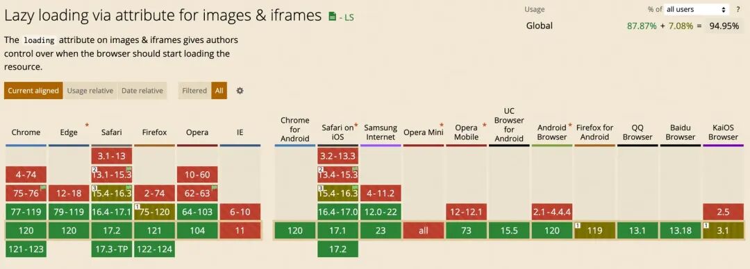 在图片较多的场景通常会对非首屏图片懒加载,一般通过 JavaScript 实现,现在大部分主流浏览器通过load="lazy"原生支持了图片懒加载,使用方法也非常简便。