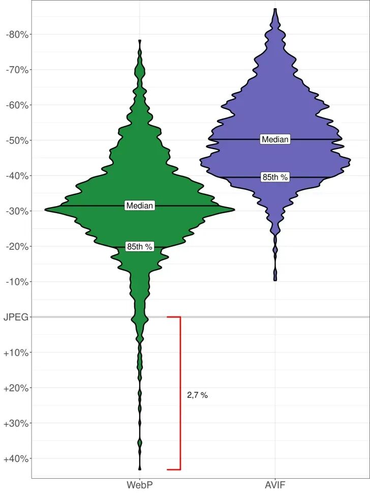 以 JPEG 做基点总体来看,AVIF全面领先,甚至是边界条件下,也表现较好。而 WebP 边界条件下可能会超过 JEPG。