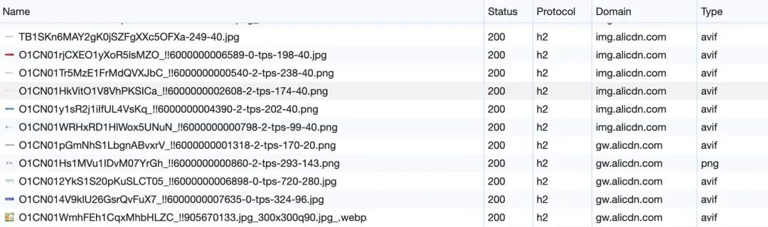 在 Chrome Dev Tools 网络面板中可以看到淘宝、京东等网站都已经开始使用 AVIF 格式图片。