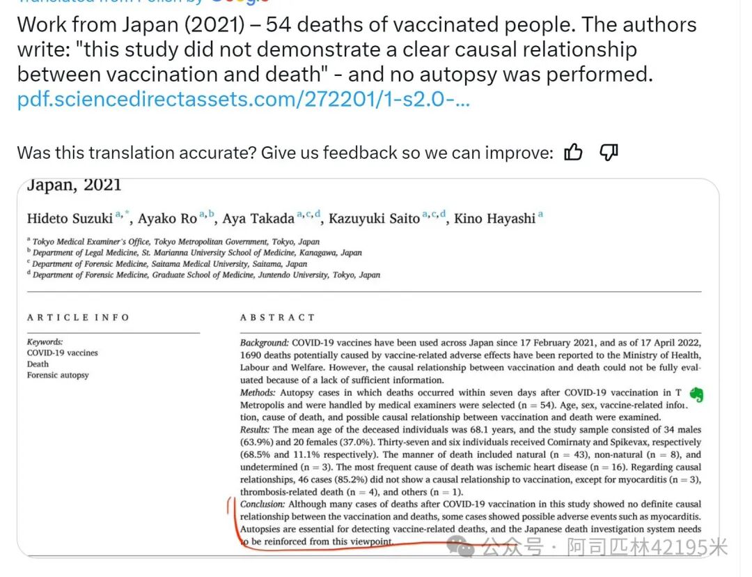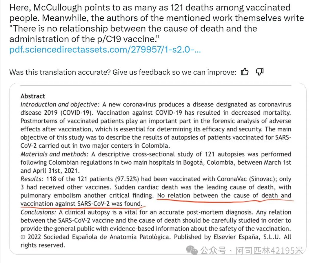 第三,文章收集的尸体解剖文章中,有的明明原作者的研究结论是”死亡和疫苗无关”: