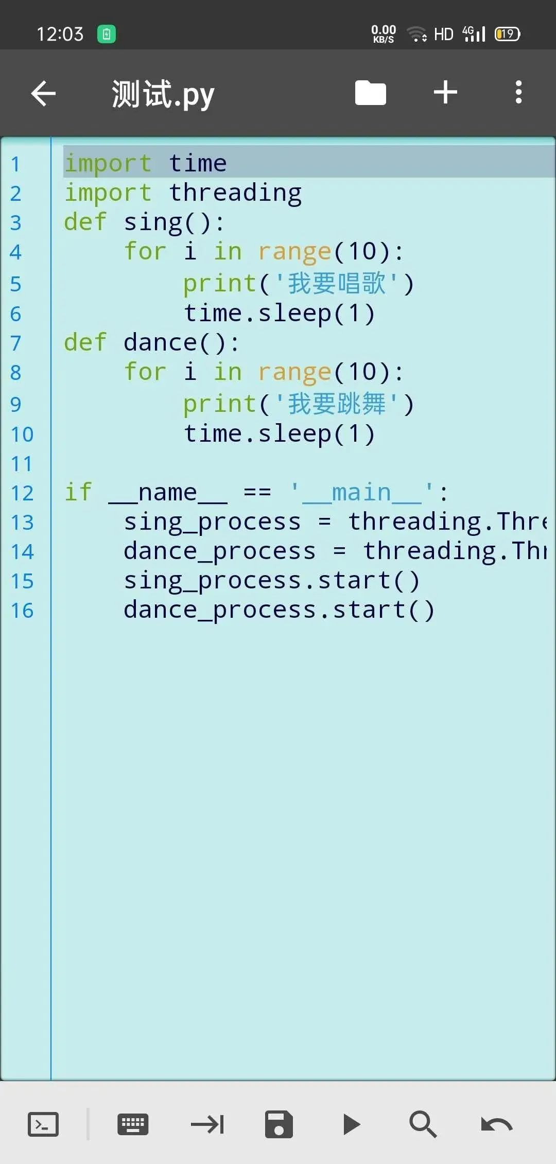 代码编辑区域代码比其他手机编程软件更灵活,底部有常用的关键字和符号。