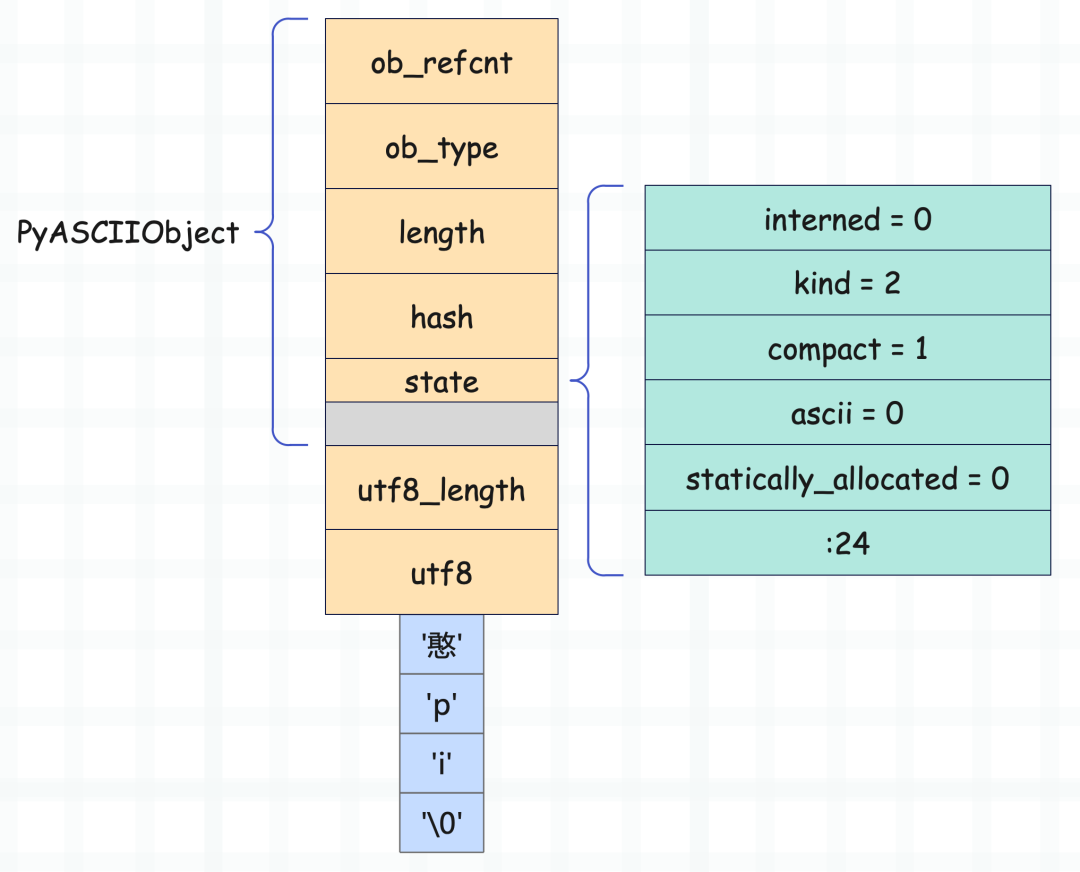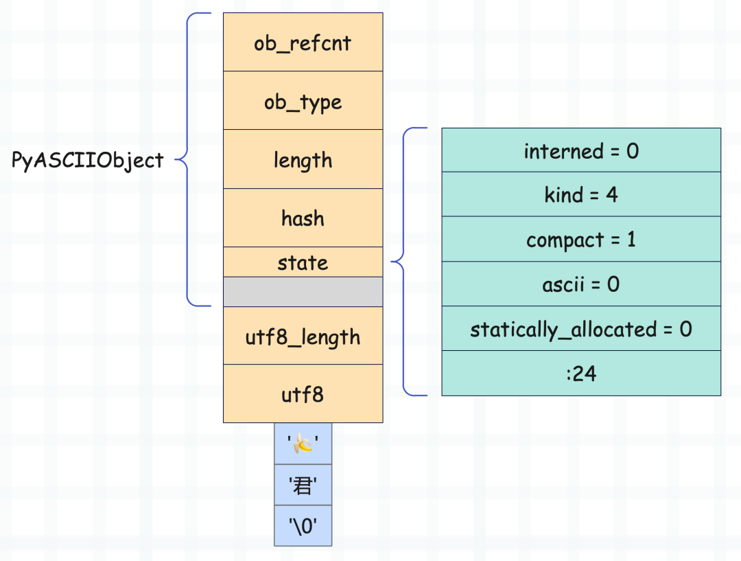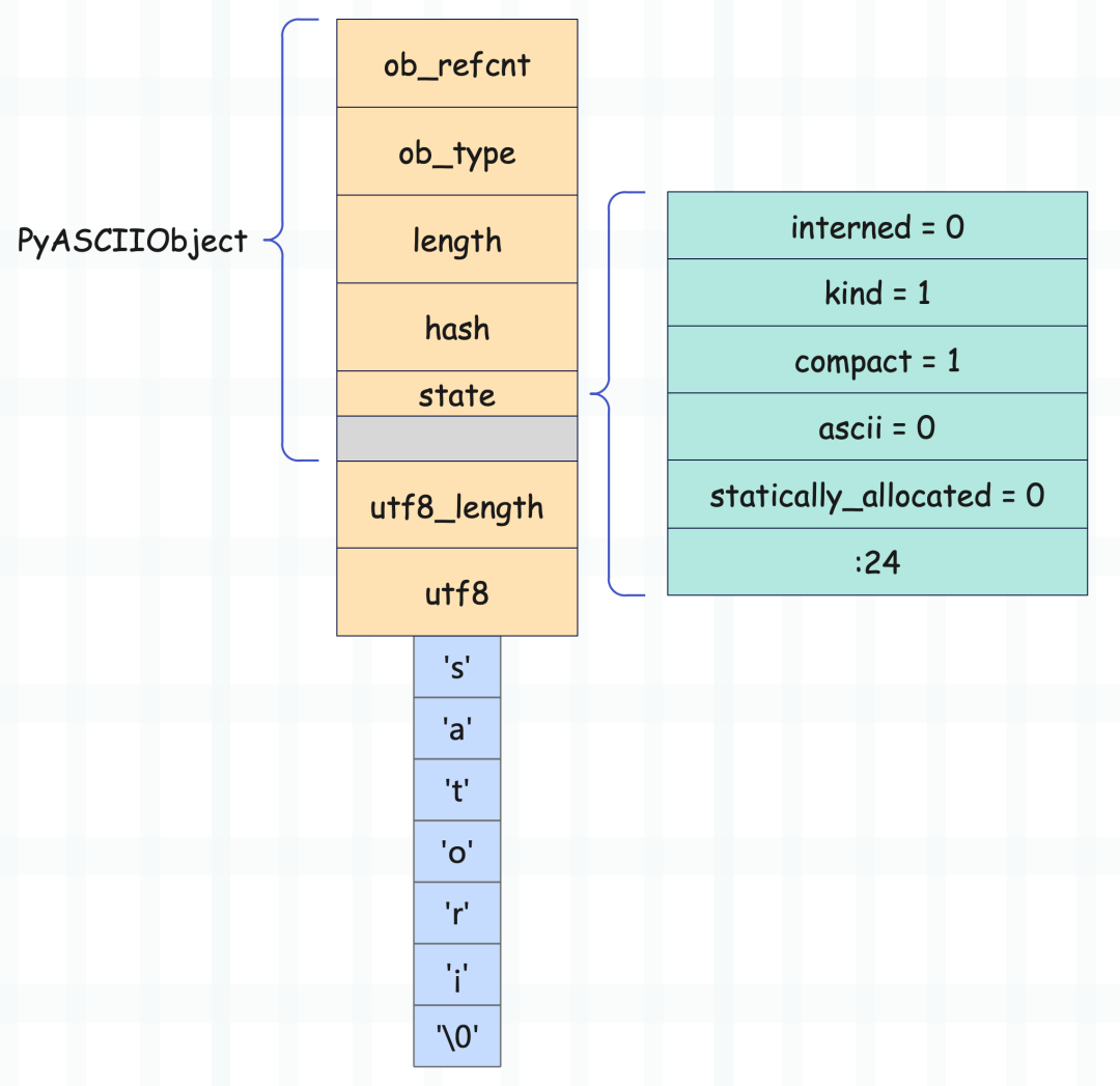 到这里可能有人好奇了,字符串的文本存在了什么地方,我们没看到结构体里面有哪个字段负责存储文本啊。答案很简单,字符串文本会直接跟在 PyASCIIObject 结构体实例的后面。