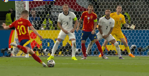 结果下半场刚一开始,机会就出现了。第46分钟,亚马尔内切,卢克-肖第一步没跟上,中后卫格伊前提帮忙,格伊位置一漏,斯通斯只能去封堵亚马尔传莫拉塔的路线,斯通斯位置丢了,沃克只好内收去堵中路插上的奥尔莫……一连串多米诺骨牌倒下之后,球到了尼科-威廉斯脚下,他的面前只剩草原上的皮克福德。尼科一脚推射,西班牙1-0领先。