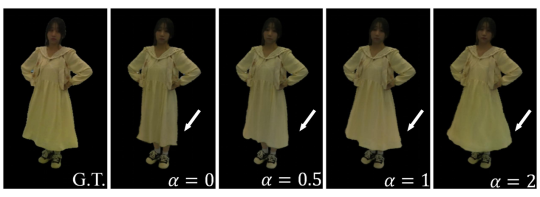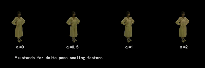 速度方面,我们通过改变 SMPL 姿态的速度(手动修改步长)来创建新的动态速度上下文。我们惊喜地发现,在不同速度模式下(不同 ),Dyco 能渲染出不同的运动效果,如低速裙摆基本垂下,而高速裙摆飘起,这与惯性效应相吻合。
