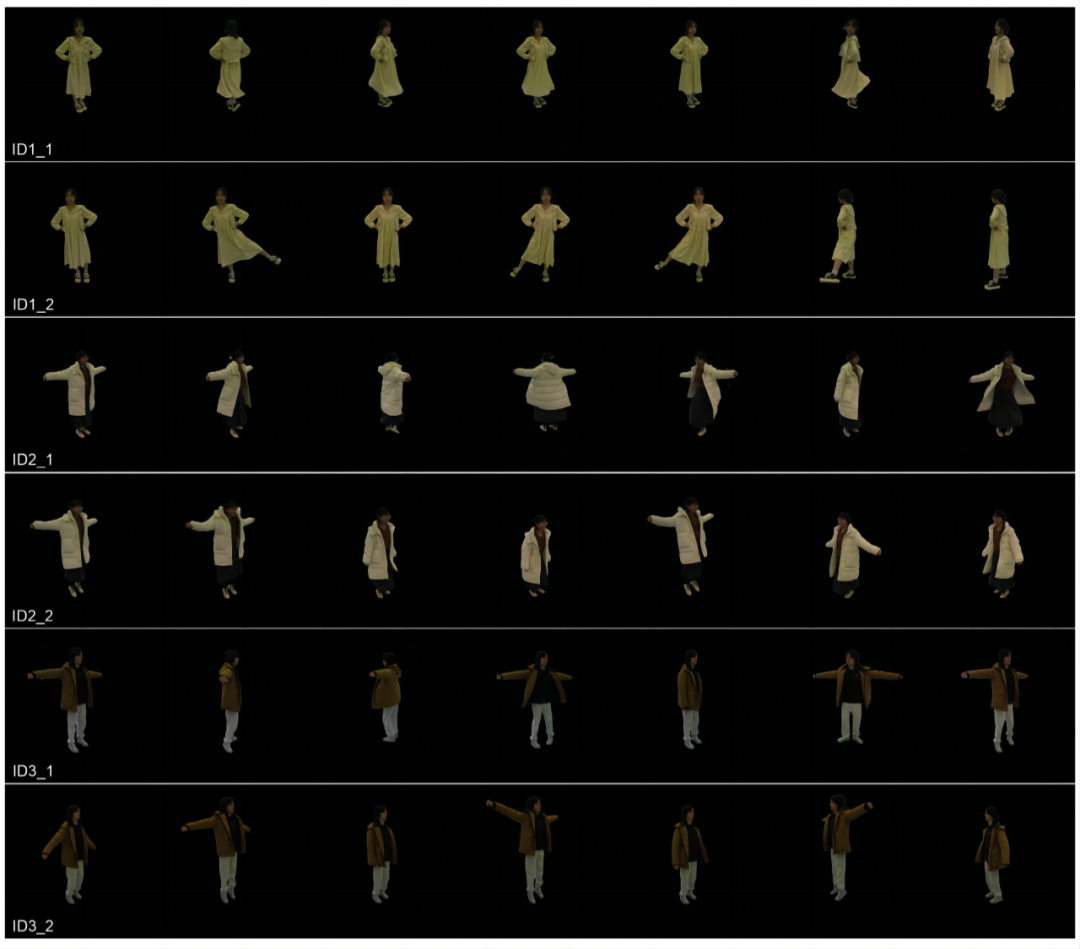 与现有数据集着装相比,我们为被试者穿上宽松的服装,如连衣裙和轻便外套,并进行复杂的加减速运动,如旋转后的突然停止、摆动和袖子的挥动。我们使用 10 台 DJI Osmo Action 相机,并以 100 帧/秒的帧率拍摄,使用音频信号同步。最终处理的数据集记录了来自 6 个动作 id 的总共 10,000 帧的序列。
