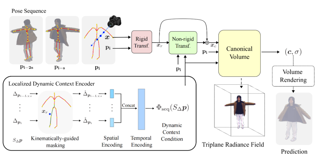 在空间上,我们将每一组 通过 MLP 降维成 16 维向量,在时间上,我们进一步将 维的特征压缩成 32 维。生成的 32 维 特征与坐标和 结合,并作为后续非刚体形变和颜色映射的输入。下图展示了我们的方法的完整流程。