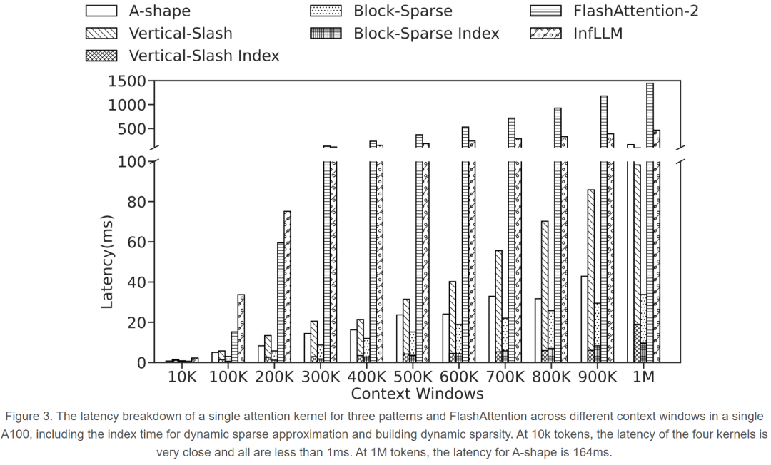 图 3 展示了本文提出的三种注意力模式以及 FlashAttention 的微基准测试结果。可以看出,Vertical-Slash 是三种模式中最慢的,但在 1M 上下文窗口下,相比 FlashAttention 仍然实现了 13 倍的加速。