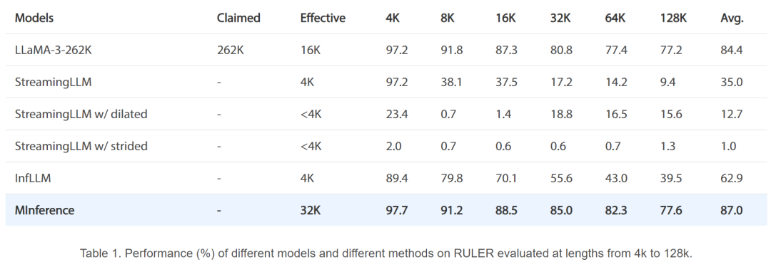 作者在一系列场景中测试了 MInference,包括 QA、编码、基于检索的任务、multi-hop QA、总结和数学任务。RULER 基准包括几个复杂的 multi-hop 或 multi-needle 任务,有效地反映了 LLM 的实际上下文窗口大小。如表 1 所示,MInference 有效地保留了 LLM 的实际上下文窗口处理能力,甚至将实际上下文窗口大小略微扩展到 32K。