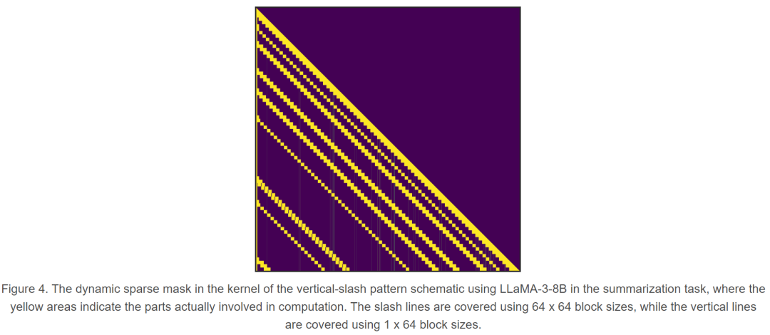图 4 展示了 Vertical-Slash 头部内核中的稀疏索引。垂直线通过 PIT FlashAttention 使用 1x64 块计算,而斜线通过块级 FlashAttention 使用 64x64 块计算。