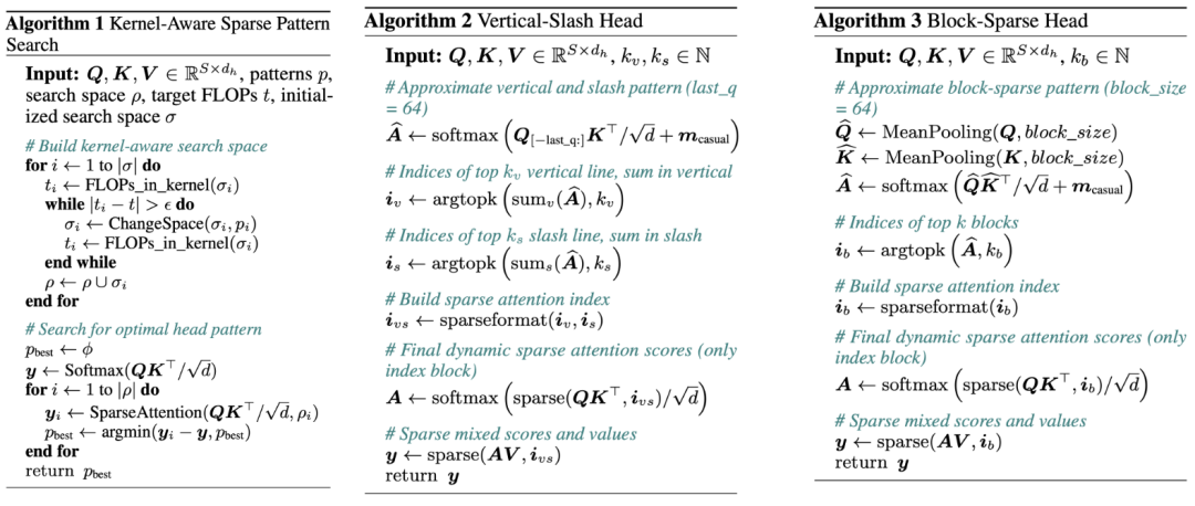 MInference 首先使用内核感知稀疏模式搜索算法为每个头部离线确定最佳动态稀疏模式,如算法 1 所示。在推理过程中,它会根据头部的模式动态逼近动态稀疏指数,如算法 2、3 所示。最后,作者使用优化后的 GPU 内核执行高效的动态稀疏注意力计算,大大减少了长上下文 LLM 的预填充阶段延迟。