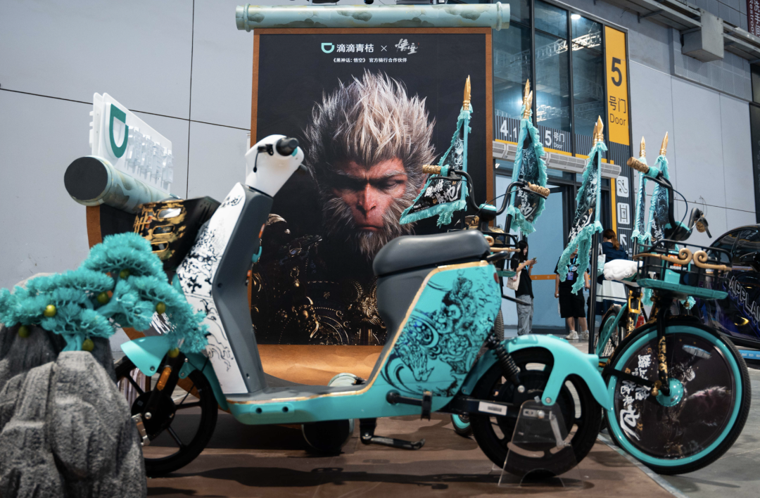 痛车区不远,就能看到青桔这次和黑神话合作出了一台痛车,无论是配色还是贴纸设计,契合度都挺高。