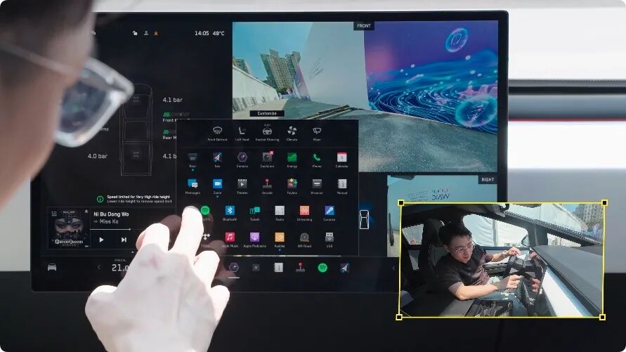 所有功能它都是全盘托出,不需要再多打开什么菜单,比如这里的悬架调节、后斗开关,都是在一个框里直接调节,用起来就是很简单、很舒服。