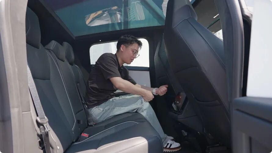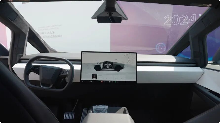 作为一辆特斯拉,咱们就别想着内饰有多少 “ 冗余配置 ” 了, Cybertruck 还是一脉相承的简约,仪表台除了一条横贯左右的金属,基本没有别的装饰。