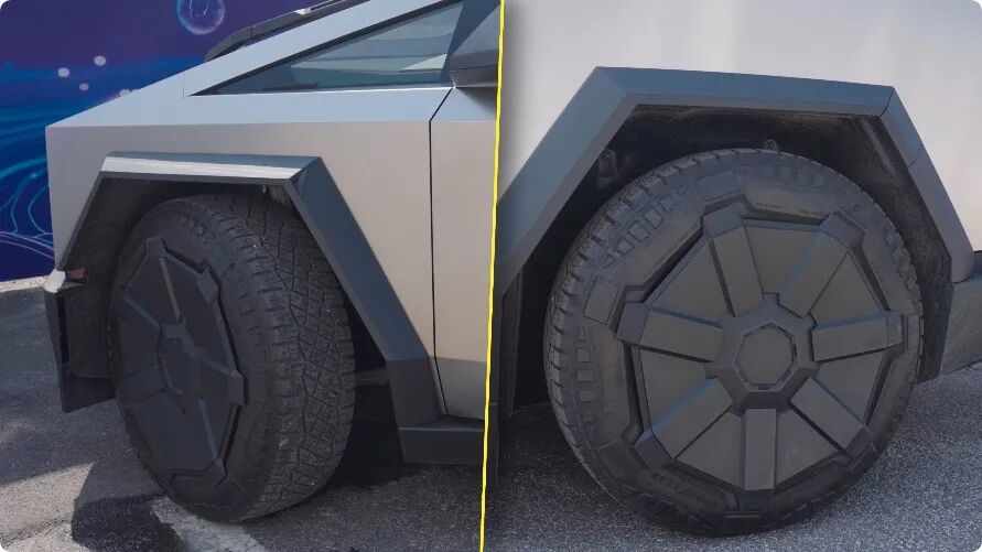 为啥这么灵活呢?咱们之前说的后轮转向,这台 Cybertruck 上也有。