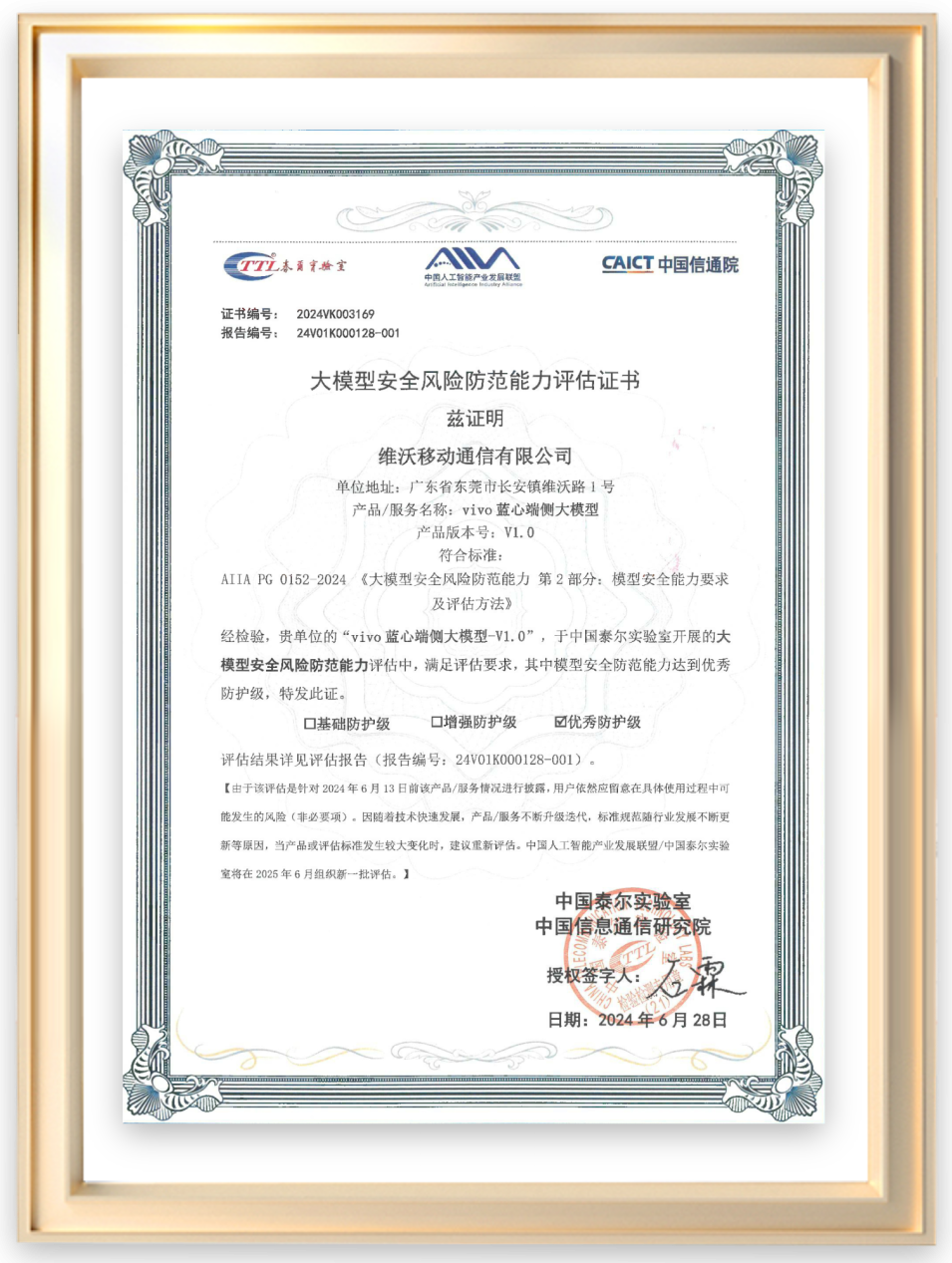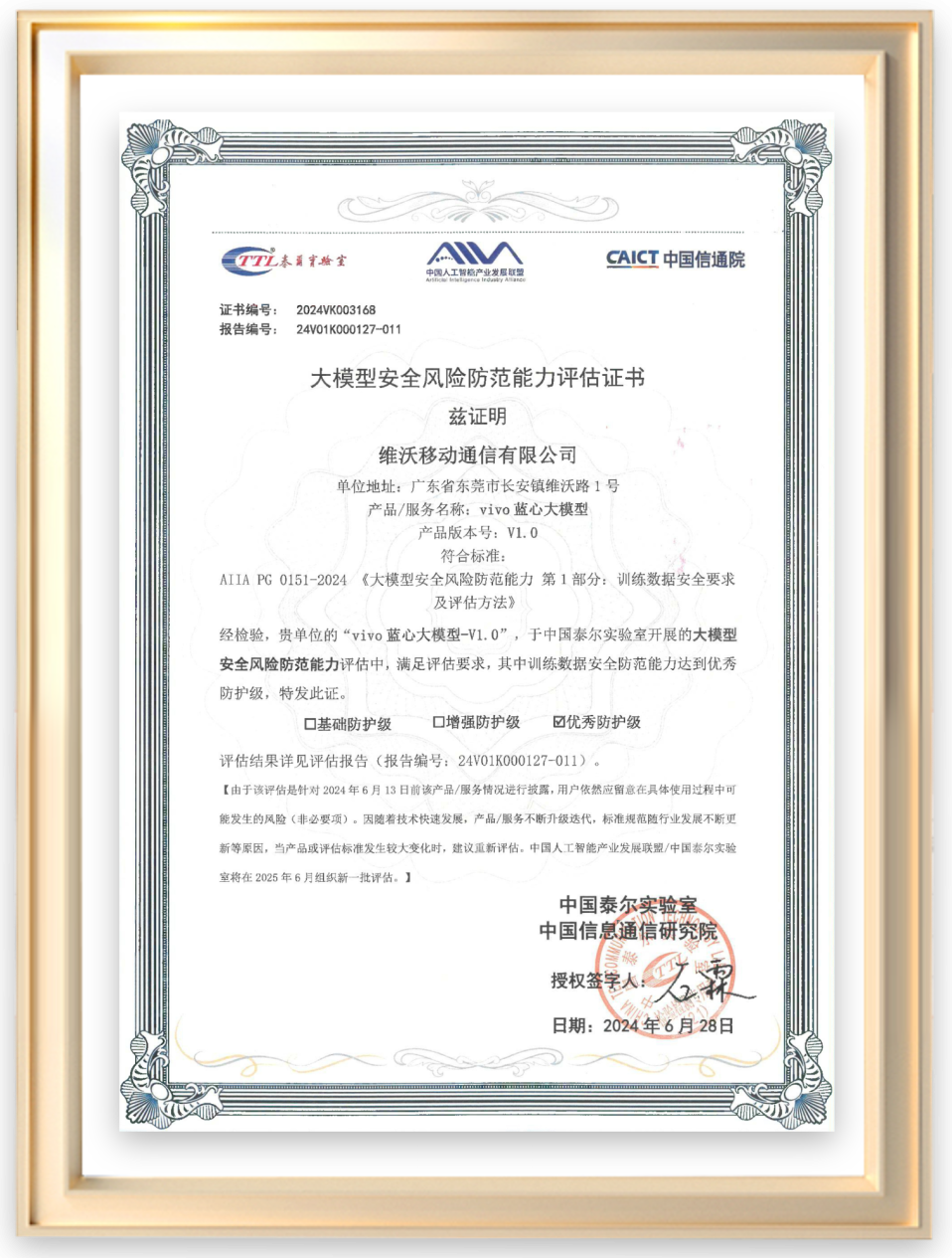 该评估依据AIIA/PG 0152-2024《大模型安全风险防范能力 第2部分:模型安全要求及评估方法》,针对大模型技术提供方(以下简称“提供方”)的模型安全,从模型可信和模型安全两个维度提出大模型的安全能力要求及评估方法。在模型可信方面,重点评估模型面对干扰的鲁棒性、模型披露信息的透明度以及输出内容的公平性。在模型安全方面,一方面通过已知的模型攻击方法开展模型安全测试,另一方面基于技术提供方披露信息评估模型的安全保障能力。**为了降低用户大模型使用安全隐私顾虑,**vivo自主研发的蓝心端侧大模型,搭载于X Fold3 Pro机型,也顺利通过了AIIA测评,验证了大模型的安全风险防范能力,获得最高认证级别优秀防护级。