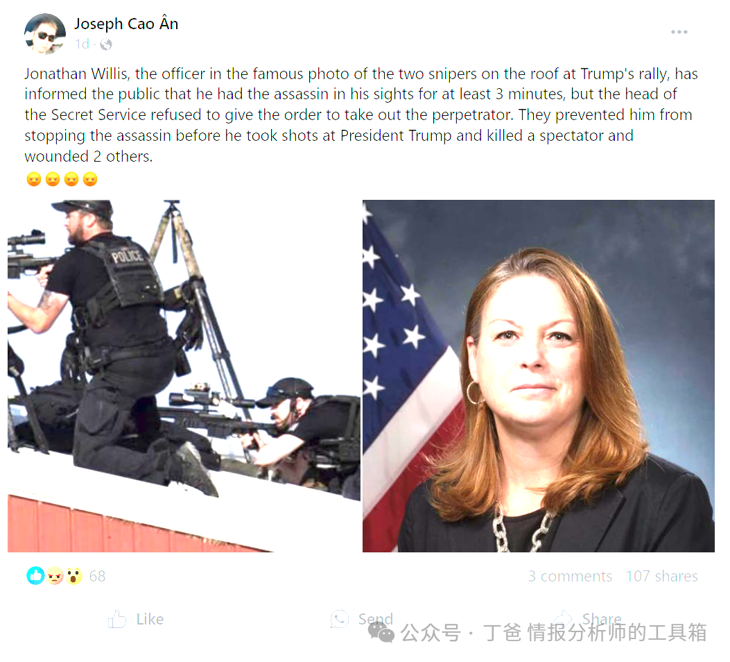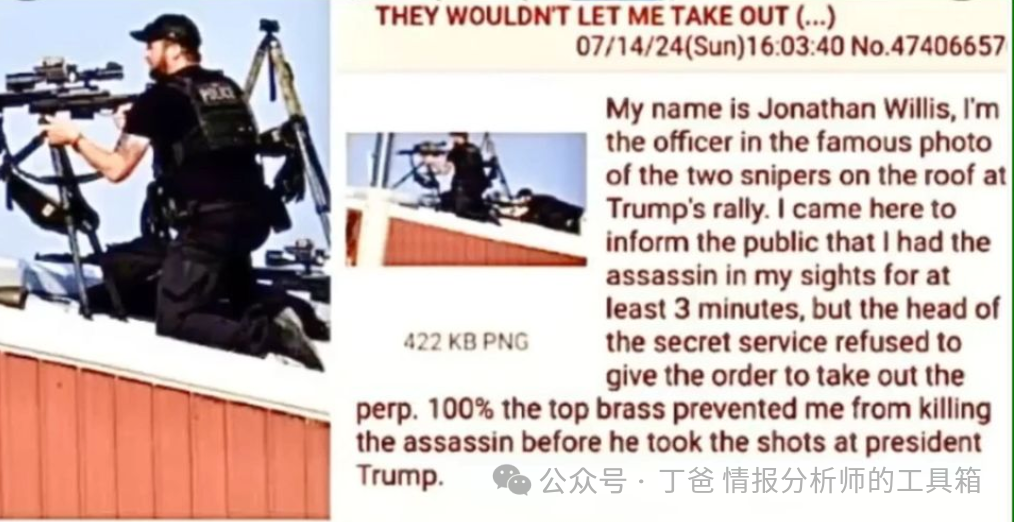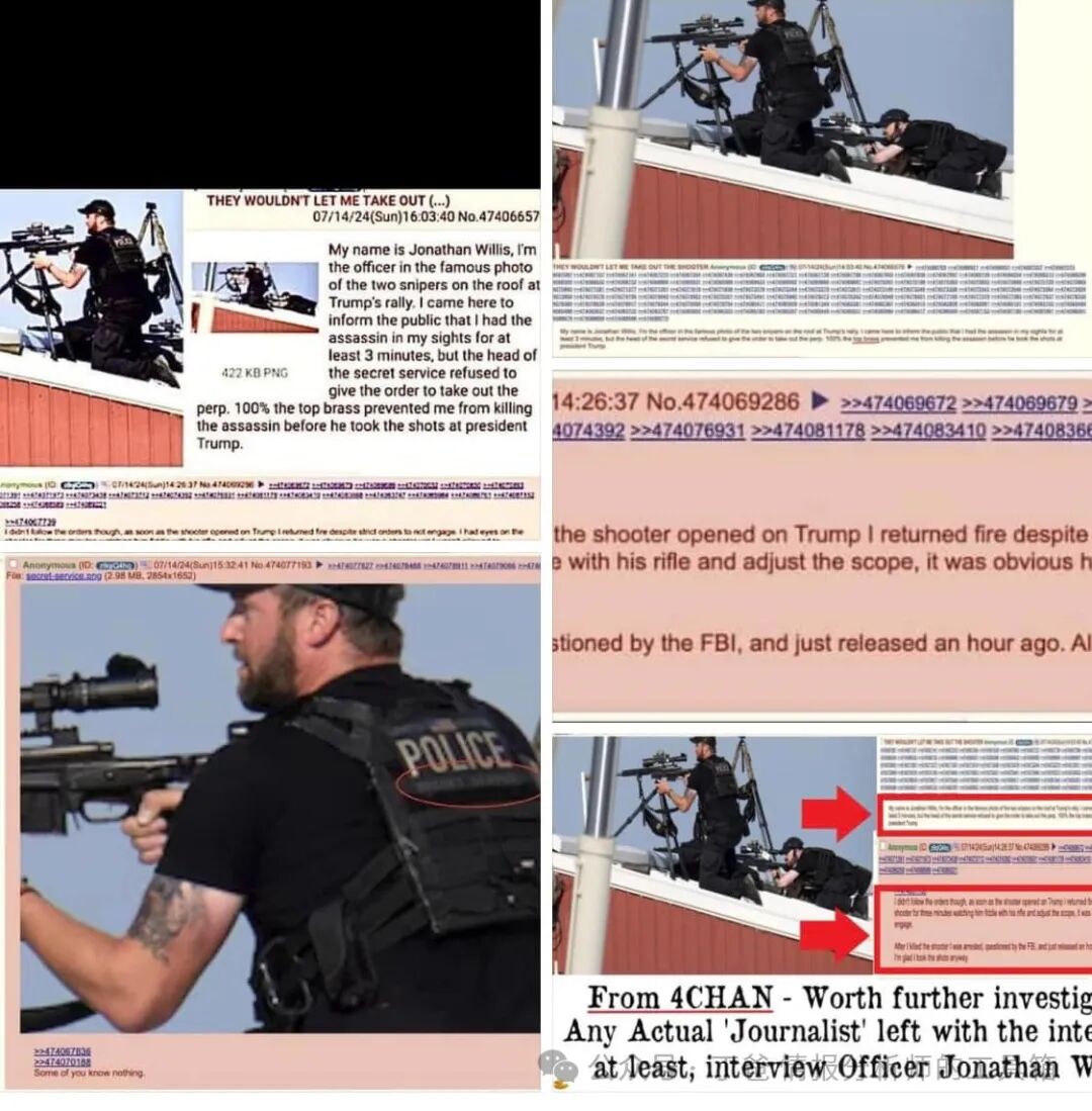 网上有大量的转发信息:“我叫乔纳森·威利斯。我就是那张著名的照片中的警官,照片上有两名狙击手在特朗普集会的屋顶上。我来这里是想告诉公众,我已经瞄准了刺客至少 3 分钟,但特勤局局长拒绝下令干掉罪犯。在刺客向特朗普总统开枪之前,高层 100% 阻止了我杀死他。”